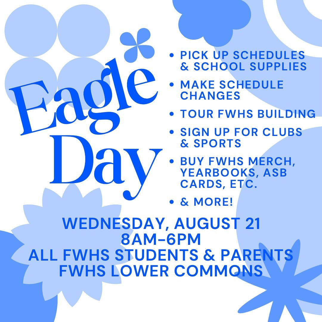 Hi Eagles! It's almost the first day of school. Get ready for school by coming to Eagle Day on AUGUST 21ST at FWHS' Lower Commons from 8 AM-6 PM!